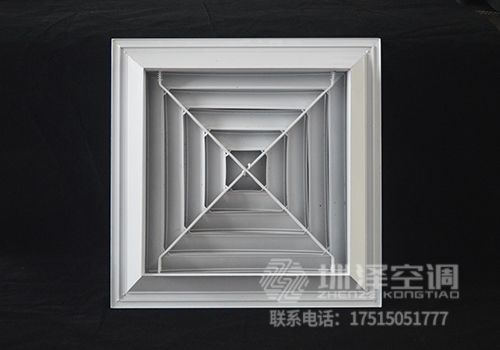方形散流器先調挺直,表面光潔,葉片角度為固定式,葉片采用夾角片沖壓連接,整個葉片與邊框采用分離式結構,以方便安裝與調節。設計時可根據房間造型不同,選用不同出風方向的散流器,可與調節閥配套使用。方形散流器有四種氣流吹出形式,分別為一面吹(A1SO)、二面吹(A2SO)、三面吹(A3SO)、四面吹(A4SO)。鋁合金表面經陽極氧化處理,也可根據用戶要求進行靜電噴塑處理。