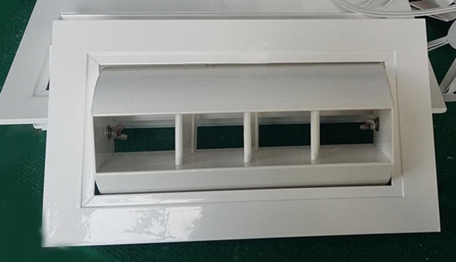 鼓形風口具有送風角度雙向調節的特點,用作空調系統和通風系統的送風出口。風口為矩形外框結構,外框內套有鼓殼,鼓殼內設有聯動流線型活動葉片。鼓殼可以在俯仰方向上沿水平軸在正負300度的角度范圍內調節。連桿葉片可以在正負450度的角度范圍內沿水平方向調節。改變空氣供應的方向。風量可以用風量調節閥調節。